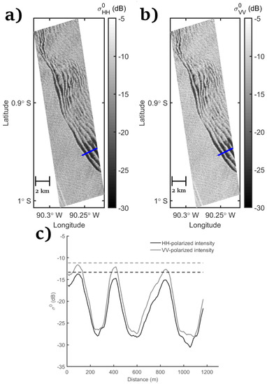 L-band ALOS-PALSAR image acquired on 2009.03.14 showing an example of an internal wave (IW) near Galapagos Island. (a) HH-polarized intensity channel (i.e., ) image, (b) VV-polarized intensity channel (i.e., ) image, where the blue line represents the selected IW profile; and (c) IW profile associated to HH- and VV-polarized intensity channels, where the black and gray dashed lines correspond to the mean value of the background associated to, respectively, HH- and VV-polarized intensity.