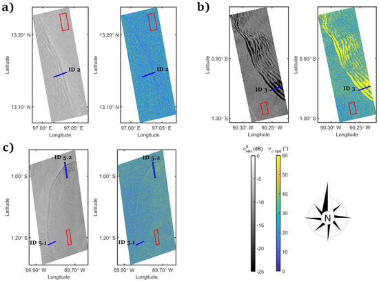 The HH-intensity (left) and standard deviation of co-polarized phase difference (CPD) (right) ALOS-PALSAR (APL) excerpt images showing IW signatures related to: (a) Image ID 2 acquired in Andaman Sea on 2007.04.14; (b) Image ID 3 acquired in Galapagos Marine Reserve (GMR) on 2009.03.14; and (c) Image ID 5 acquired in GMR on 2009.08.28. The selected IW profiles and ROI representing the backgrounds are depicted in blue lines and red rectangles, respectively. Please, note that the profile ID numbers are depicted in the figures. More information about the images can be found in Table 1.
