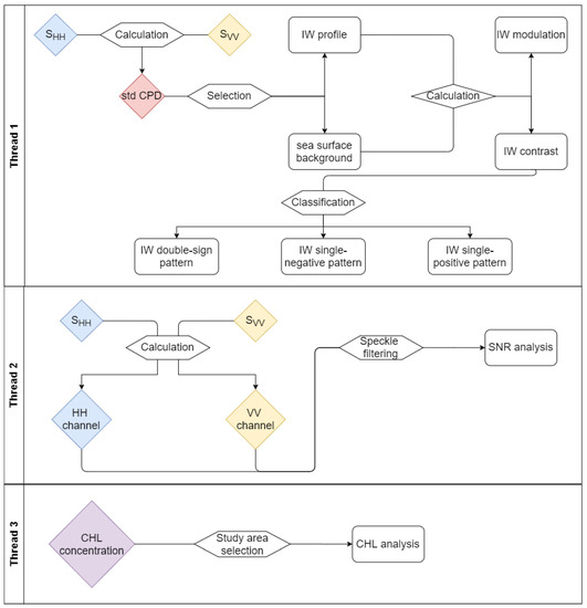 Flowchart of the methodological approach, where thread 1, 2, and 3 represent, respectively, the analysis of the IW contrast profiles according to the IW signature type, the analysis of the signal to noise ratio (SNR), and the investigation of the chlorophyll-a concentration maps associated to each SAR image of our data set.
