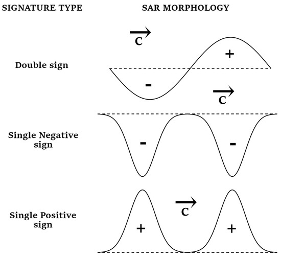 Scheme representing the IW signature type and the its SAR morphology. The dashed black line represents a homogeneous sea surface background. The IW phase velocity is represented by the C vector.
