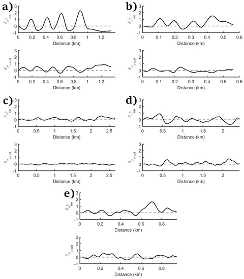 Figure 5. and profiles (upper and lower, respectively) associated to: (a) Image ID 1; (b) Image ID 4; (c) Image ID 6; (d) Image ID 7; and (e) Image ID 9 (Profile ID 9.1). The dotted green lines show the ; where . - single-negative IW signaturesConsidering the single-negative signatures, 4 HH-polarized contrast profiles of our data set correspond to this class (or kind) of signature. The profiles and their corresponding are depicted in Figure 6. The are mostly negative, as expected; while, the are mostly positive. The varies between 1.02 (Image ID 5) and 1.47 (Image ID 8). Please, see Table 2. The varies between 0.73 and 2.59. Note that, the are more than 22% higher than the corresponding considering the range-propagating IW signatures, (i.e., Image ID 3, 8 and 9). The possible explanation for the higher associated to those single-negative IW signatures is the coupled effect of the hydrodynamic modulation (as discussed previously for the IW double sign signatures) and the role of surfactant films that enhance the co-polarized channel decorrelation, increasing the values associated to the IW rear slope signatures. As demonstrated in [6], the IW negative contrast in radar power is stronger as surfactant film concentration (or film elasticity) increases. In another way, Image ID 5 has 30% lower than its corresponding . It is important to point out that the IW signature in Image ID 5 is propagating in azimuth direction. As discussed by [6], the azimuth-propagating IW signatures are many times dominated by single-negative signatures. We recall that we use the same model in [6] to explain the class of signatures reported in this paper. In the particular case of azimuthally propagating IWs, positive contrast variations are absent in the model, and the backscatter contrast is expected to be negative, in agreement with the observation in Figure 6b (top panel). This is a consequence of assuming Bragg scattering and hence the IW hydrodynamic modulation does not change significantly range propagating Bragg waves for azimuth propagating IWs. Thus, the lower values of in this case can be explained by the fact that the increasing decorrelation between the co-polarized channels associated to the IW rear slopes are due only to the surface film modulation effect.