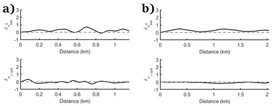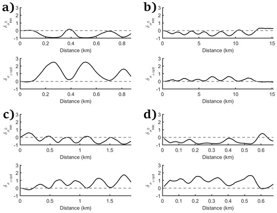 Figure 6. and profiles (upper and lower, respectively) associated to: (a) Image ID 3; (b) Image ID 5 (Profile ID 5.2); (c) Image ID 8; and (d) Image ID 9 (Profile ID 9.2). The dotted green lines show the ; where .Please note that considering all single-negative IW signatures, the maximum and minimum values are associated to the IW troughs and crests, respectively, and the correlation between the and values are always higher than 0.81, for single-negative IW contrast. - single-positive IW signaturesWe identify 2 HH-polarized contrast profiles that follow the single-positive IW signature. The profiles and their corresponding are depicted in Figure 7. As expected, the values are mostly positive; while, considering image ID 2, the signatures have a double sign pattern and, for image ID 5, the values are mostly negative. The are 0.80 (Image ID 2) and 0.47 (Image ID 5). Please, see Table 2. The for Image ID 2 and Image ID 5 are, respectively, 0.61 and 0.20, i.e., more than 23% lower than the . According to [6], when the wind speed is very low (<2 m/s), the IW can be imaged as bright bands only since the expected dark bands are lost in the dark SAR image background. Another complementary theory presented in [40] associates the IW single-positive signatures to either or both the following mechanisms: (1) generation of bound centimeter-decimeter waves with Bragg wavelengths; and (2) wave breaking. The latter mechanisms are the responsible by a positive contrast even on the IW rear slope due to the indirect contribution of meter-scale waves to the backscattered signal [41]. We note in passing that some advanced radar imaging models use a composite surface expansion, which account for long-wave–short-wave interaction terms resulting in upwind–downwind differences of the backscattered signal, and hence could explain single-positive signatures [42]. Thus, no decreasing in the sea surface backscattering related to the IW rear slope is expected as well as no increasing decorrelation between the co-polarized channels (consequently, no decreasing in the SNR values are expected), resulting in no clear modulation of the . Please note that, since Image ID 2 and Image ID 5 are not acquired under low wind condition (see Table 1), the second theory (i.e., the one accounting for wave breaking) is more reliable. Considering both images there is no clear correlation between and . This is confirmed by the lowest correlation between the and (lower than 0.20).