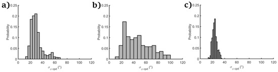 In order to better understand the behavior of the std CPD associated to each type of IW contrast profiles, normalized histograms were computed and the results are shown in Figure 8. It is important to highlight that, for computing the histogram related to the IW single-negative sign signature, the azimuth-propagating IW image was not considered (because of its anomalous behavior as pointed out previously). It can be noted that the empirical statistical distribution of std CPD is different for each kind of IW contrast profile. For the double sign signatures (please, see Figure 8a), more than 50% of the std CPD values are concentrated between the range of 20° and 35°, being the mean and std values, respectively, 30° and 10°. Considering the single-negative sign signatures (see Figure 8b), the histogram is shifted to higher std CPD values, i.e., more than 50% of the std CPD values are concentrated within the range of 22° to 52°. Furthermore, the histogram becomes wider, with mean and std values of, respectively, 47° and 20°. The single-positive sign signatures (see Figure 8c) are associated to the most left-shifted histogram (i.e., shifted to lower std CPD values, with more than 50% of the std CPD values being within the range of 22° to 26°) as well as it has the narrowest histogram (mean and std values of, respectively, 24° and 4°). Since higher std CPD values are expected over the sea surface under the influence of slicks [19,20,21,43], the results related to the histograms analysis confirm the previous outcomes in this paper, principally, regarding the possible influence of surfactant films on the IW single-negative sign signatures.