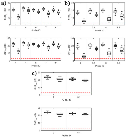 Figure 9 shows the SNR associated to the IW crests and troughs for each profile. The results are presented in the graphical format known as box plot, where the median SNR is represented by the horizontal line inside the box, while the first () and third quartiles () are, respectively, the lower and upper lines of the box. The minimum and maximum values excluding outliers are, respectively, the lower and higher short horizontal bars. The minimum and maximum values are calculated, respectively, using and , where IQR is the interquartile range (i.e., ). Since we have identified three different types of HH-polarized contrast profiles, , in our data set, i.e., double (Figure 9a) and single-negative and -positive signatures (respectively, Figure 9b,c), the results are organized according to the type of IW signature. Please note that the SNR associated to the VV channel is also shown, as well as the dashed red line representing the 3 dB threshold (below this threshold we consider the measurements as very low signal samples).