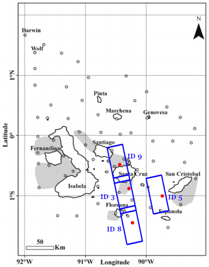 Frames of the SAR images associated to the IW single-negative sign signature (blue rectangles) overlaid to the productive habitats of the GMR indicated as gray shaded regions. The red dots show the region where the IW profiles were extracted. Adapted from Figure 10 in [34].