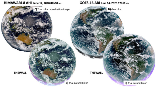 For many years geostationary satellites have surrounded and observed the Earth. In the last decade, their resolution has improved to 1 km at nadir. At the same time, real-time reception of imagery has become increasingly practical through satellite downlinks and online-accessible archives. However, little effort has been devoted to the creation of images showing the whole Earth in the splendor of its natural color. One of the main reasons is that often one or more components of the visible spectrum is not measured by the sensors on-board the satellites. In this application, we have selected three geostationary satellites to tile the entire globe: (1) The MSG2 “Spinning Enhanced Visible and Infrared Imager” (MSG2 SEVIRI) instrument managed by EUMETSAT was launched in 2002, and offers a resolution of 3 km at nadir. It covers Europe, Africa, and the Middle East. However, the blue and green visible bands (0.4 and 0.5 μm) are missing and make this satellite almost blind over the spectral range of human vision. (2) The NASA GOES-16 series “Advanced Baseline Imager” (ABI) [1] instrument covers the American continent. Launched in 2016, and managed by NOAA, it has a resolution of 1 km at nadir but it lacks the visible green band. (3) The Himawari-8 [2,3] “Advanced Himawari Imager” (AHI) instrument managed by the Japan Meteorological Agency (JMA) was launched in 2014. This instrument captures all three visible bands with a resolution of 1 km at nadir and covers the Western Pacific region. These three instruments offer detailed and quantitative monitoring of a wide array of surface and atmospheric parameters [1,4]. Although the tracking of atmospheric and land-surface phenomena usually requires the interrogation and combination of multiple spectral bands, we think it is also desirable for the human eye to view the spectral data in natural color RGB composites to help the analysis of the image components.