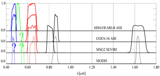 Normalized spectral response functions of Himawari-8 AHI, GOES-16 ABI, MSG2 SEVIRI (solid lines), and MODIS (dotted lines) visible and near-infrared (VNIR) bands, shifted along the y-axis for the sake of clarity. The questions marks indicate the missing visible bands in GOES-16 ABI and MSG2 SEVIRI imagers.