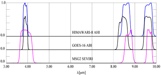 Normalized spectral response functions of Himawari-8 AHI, GOES-16 ABI, and MSG2 SEVIRI infrared bands in μm, shifted along the y-axis for the sake of clarity. These bands are used to build the Pseudo-Night Composites.