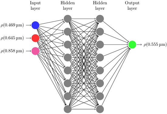 Topology of the artificial neural network (ANN) with one input layer taking 0.469, 0.645 and 0.858 μm as the reflectance values and 0.555 μm as the target value.
