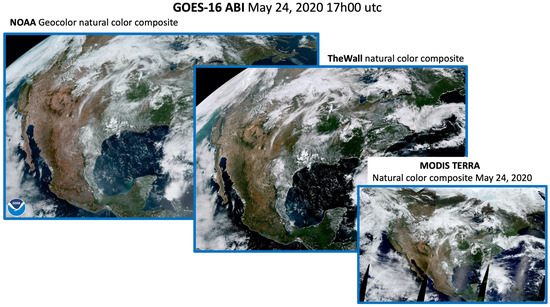 Comparison of our GOES-16 true natural color RGB composite to the GeoColor natural color composite and MODIS data, all taken over North America on 24 May 2020.