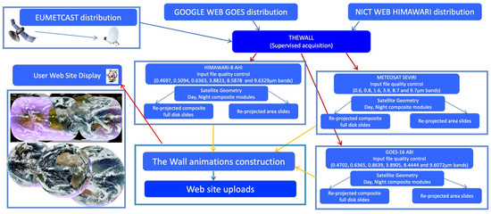 “The Wall” flowchart. “The Wall” system is divided in three levels. The first level is devoted to the data acquisition from the three geostationary satellites (EUMETCAST distribution, Google Cloud Platform, and the NICT Science Cloud [10,11]). The second level computes the RGB true natural color composites. The third one creates all the animated global mosaics and subsets.