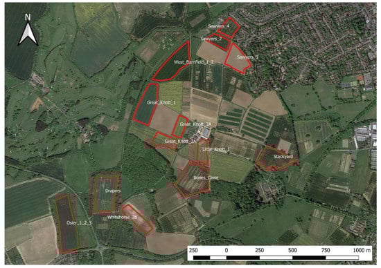 Google Earth image of Rothamsted Research experimental farm (coordinate system EPSG:27700), with wheat field boundaries from 2017, 2018, and 2019 indicated using red lines (see also Table 1).