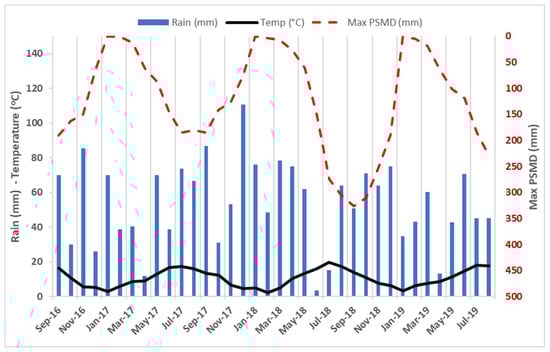 Total monthly rainfall (mm) and mean air temperatures (°C) on the primary axis (left) and maximum potential soil moisture deficit (PSMD; mm) on the secondary axis (right) at Rothamsted farm from September 2016 to August 2019.