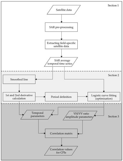 The Sentinel-1 SAR data acquired for the Rothamsted Research farm, over the three-year study period were derived from orbit 132 (ascending) with a temporal resolution of six days. One of the reasons for selecting a single orbit is the orientation of the view of the satellite, which plays a significant role in the direction of the emitted beam from the SAR antenna [49,50]. Using the same orbit also had the advantage of a similar incidence angle (range of 5°) for adjacent fields on even terrain [49]. The ascending orbit 132, instead of descending 81, was also used to avoid early morning measurements when dew may become a confounding factor [14,45]. Temporal profiles of the S1 VH/VV backscatter ratio were plotted on each field to define the curves’ shapes and amplitude, which were related to ground observations of wheat at key growth stages, assisting in the definition of periods defined by the calculated parameters. Figure 3 displays the flow diagram with all the needed steps of the analysis.