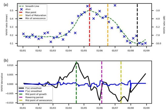 (a) Mean VH/VV ratio from Sentinel-1 orbit 132 of wheat field (for the Swayers_4 field in 2018) together with a smoothed curve of the mean (with the date of the maximum point indicated) and (b) first (f′x) and second (f″x) derivative (bottom) of the smoothed field-averaged line. The date of the midpoint of the growth period, and the date of the start, midpoint, and minimum value of the maturation period are indicated as vertical dotted lines. The secondary y axis in the first graph displays the VH/VV ratio on a decibel scale for reference.