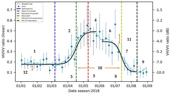 where base is the minimum VH/VV ratio value, Max is the maximum VH/VV ratio value, b is the steepness of the logistic curve, and to is the x-value of the sigmoid inflexion point. The calculated values are sensitive to a clear definition of the period represented by each sigmoid curve (Figure 5). The growth period curve was defined from the beginning of the season (Parameter 1 in Figure 5) up to the time of maximum value of the smoothed curve (Parameter 5). The maturation period curve was defined as the period after flowering to the minimum value in the maturation period of the temporally smoothed curve.