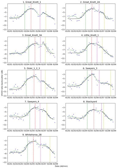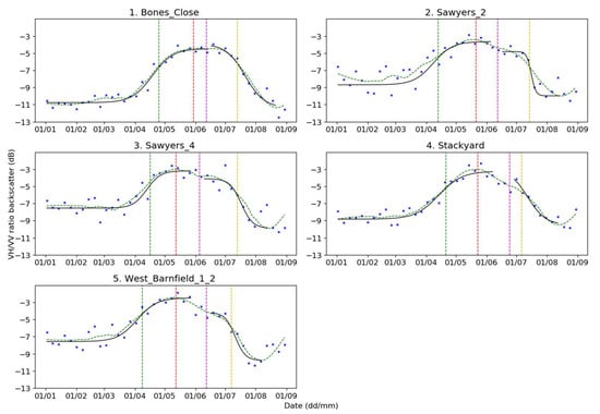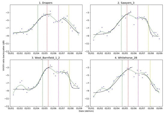 The next stage was to further parameterise and automate the extraction of these dates and test if they were linked to wheat development. The smoothed VH/VV curve was divided into two periods: (i) growth and (ii) maturation and senescence to address an observed change in maximum values in the middle of the season. The splitting of the analysis into two periods was also used by Che et al. (2014) [41], who analysed the temporal evolution of the leaf area index (LAI) of vegetation during development and senescence in Shandong Province, China. The breakpoint of two curves occurs during the flowering period (anthesis) when the wheat has reached its full height. The calculation of the breakpoint specifies the start for the VH/VV ratio stabilisation period close to the end of spring.