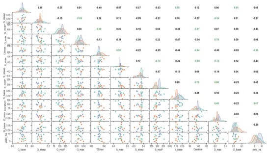The interactions between each of the parameters and yield were further displayed using a correlation matrix (Figure 9). There were various significant correlations between parameters. As would be expected, the inflorescence indicator (D_max = G_max – S_max) was correlated with the two parameters used in the calculation (G_max and S_max), with r values of 0.76 and −0.75, respectively. At the same time, significant correlations were found between D_max and G_steep (r = −0.54), S_midP (r = 0.68), and Duration (r = 0.49). By contrast, D_base displayed no significant correlations with the other parameters, with the exception of G_base (r = 0.65) that was used for its calculation. The definition of D_base is G_base minus S_base, where S_base represents the VH/VV ratio value on bare soil (that should remain relatively consistent) and the value of G_base is determined by the combination of soil and low vegetation during the tillering period.