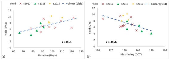 Scatter plot showing the relationship between Yield and (a) Duration and (b) the timing of the maximum value of VH/VV (Tmax). The r value and best fit linear line for each relationship, across the three seasons, is shown.