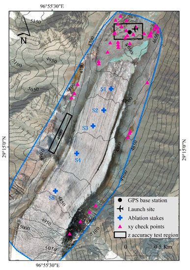 Orthomosaic of Parlung No. 4 Glacier from UAV imagery acquired in October 2019. Additionally shown are the locations of 43 off-glacier check points for validation of horizontal accuracy (pink triangles) and two off-glacier regions for the validation of vertical accuracy (black rectangles). Blue cross represents the locations of five ablation stakes. The contour lines were made by using the 12.5 m resolution Alos Palsar DEM from Alaska Satellite Facility. Blue line shows the boundary of the UAV mosaic. The background satellite image was taken from Esri DigitalGlobe (Redlands, CA, USA).