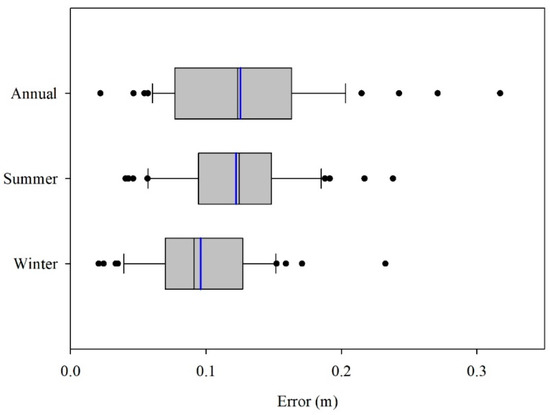 Horizontal errors estimated from the 43 fixed points around the Parlung No. 4 Glacier (shown in Figure 2) with the mean (blue vertical lines) and the medium (black vertical lines) and the quartile to extreme ranges of 25%, 50%, 75% and 90% (black dots) for the cold season (winter), warm season (summer) and annual scale.