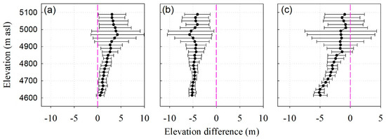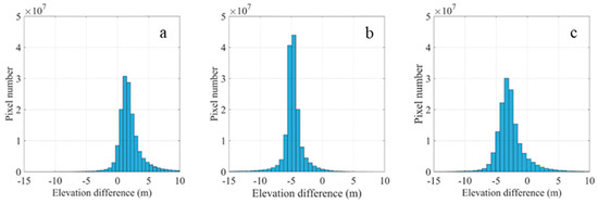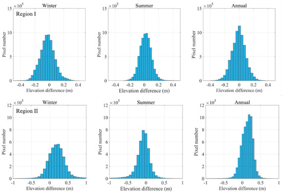 The histogram of height differences between three DEMs in Region I shows that the most of the vertical difference ranges from −0.2 m to 0.2 m (Figure 4). The mean DEM difference was −0.03 ± 0.11 m for the cold season, 0.02 ± 0.09 m for the warm season, and −0.01 ± 0.1 m for the annual scale, respectively. The median values were −0.03 m for the cold season, 0.02 m for the warm season and −0.01 m at the annual scale. For Region II, the accuracy is slightly decreased but still with decimeter accuracy, with the mean DEM difference of −0.22 ± 0.32 m for the cold season, −0.10 ± 0.28 m for the warm season and 0.13 ± 0.16 m for the annual scale, respectively. Such examination on two different regions revealed that the vertical uncertainties derived from the comparison of DEMs should be limited to decimeter-accuracy.