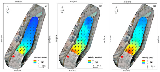 Mean daily flow vector for cold season (a), warm season (b) and annual total movement (c) at the lower part of Parlung No. 4 Glacier, with the location of a cluster of surface debris (red star) to derive the point horizontal displacement near the icefall region.