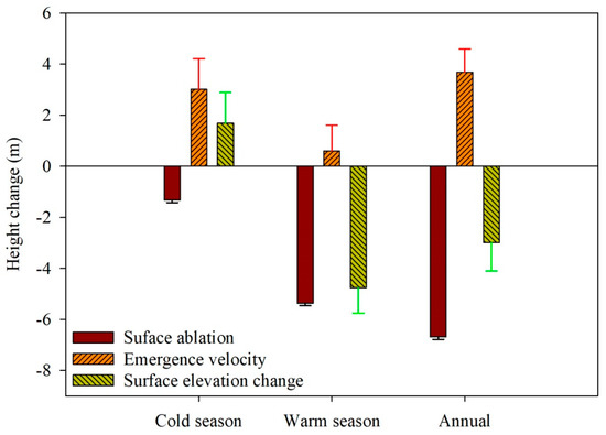 In order to clarify the overall contribution of each component in the ablation zone, the values of each component at five stake locations was averaged to represent the mean condition in different seasons (Figure 9). Regarding the uniform distribution of stakes along the central flowline (Figure 2), we assume that such a simple spatial average can be taken to represent conditions across the wider ablation zone. Using the UAV-SfM orthomosaic-derived elevation change data as a result, the averaged δH/δt among the five stakes (Table 2) agree well with the values averaged by all regional pixels below the elevation of 4850 m (S5), with 1.7 ± 1.1 m vs. 1.5 ± 1.0 m in the cold season, −4.8 ± 0.9 m vs. −4.8 ± 0.9 m in the warm season and −3.0 ± 0.9 m vs. −3.3 ± 1.2 m across an annual timeframe, respectively. The mean emergence for five stakes was therefore estimated to be 3.0 ± 1.2 m. These data clearly demonstrate that considerable ice supply from the upper glacierized region contributes to the downstream elevation increase for the vast majority of the survey area in the cold season (Figure 5a). A larger gradient serves to suppress ice surface lowering at higher altitudes because of strong ice fluxes from the upper glacier, whilst allowing high rates of surface lowering to be maintained in the ablation season at lower elevations (Figure 7).