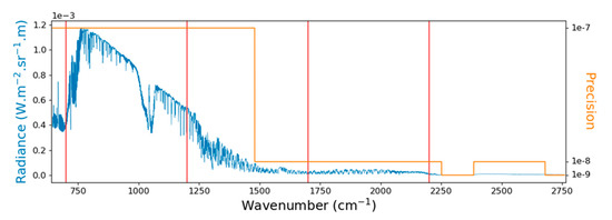 The Infrared Atmospheric Sounding Interferometer (IASI) typical radiance spectrum (left axis) superimposed with the precision used by the EUropean organisation for the exploitation of METeorological SATellites (EUMETSAT) (right axis), making the precision of the radiance values dependent on the wavenumber. The vertical red lines are the wavenumbers at which the differences were computed.