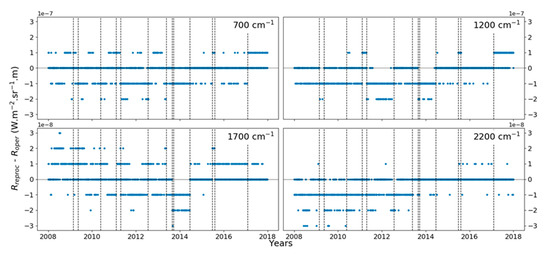 The differences are all factors of 10−7 (at 700 and 1200 cm−1) or 10−8 (at 1700 and 2200 cm−1), which means that the differences have the same order of magnitude as the precision of the radiance values. At all wavenumbers, the differences are larger before 2014. After 2014, there are still a few differences, but they are less frequent and not as large.