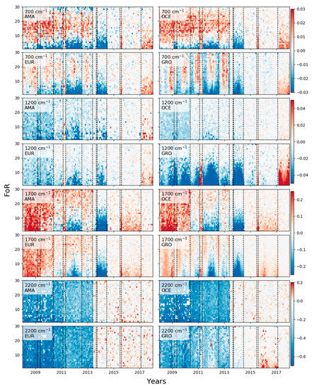 - At 700 cm−1: Large positive and negative differences (± 0.03%, negative at both ends of the scan, positive in the middle) until 2013 in the tropical regions (AMA + OCE). In Greenland and to a lesser extent in Europe, there are seasonal variations of negative and positive differences. The differences decrease after 2013 because of a second change of the Instrument Point Spread Function (IPSF) (see Table 1);