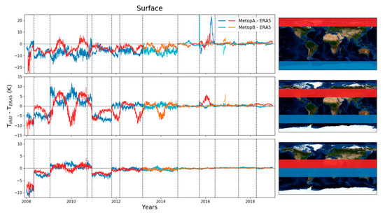 At the surface (Figure 4), differences are very large at the beginning of the IASI time series, especially for latitudes larger than 80° N. After an update in 2008 (major changes in cloud coverage, surface temperature, and temperature profiles), the differences decrease at the North Pole (~10 K after 2008) and at the equator (less than 5 K), but they are still quite large. In October 2011, improved cloud screening improves temperature retrievals and differences decrease significantly in the Tropics and mid-latitudes (with seasonal variations in the Northern Hemisphere). In September 2014, the differences decrease again and they are very small afterwards. The change corresponds to a major update in the processing algorithm with the arrival of a new IASI L2 processor. There are a few months in late 2015/early 2016 where the differences between ERA5 and IASI-A increase at mid-latitudes and the poles. In May 2016, an important improvement to the temperature retrieval algorithms reduces the large differences observed. The same thing happens for IASI-B temperatures in late 2016.