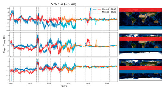 At 5 km (Figure 5), there are differences of the order of 1 to 2 K on average at mid-latitudes and the equator until September 2014. At the poles, the differences are larger (~4 K). At mid-latitudes, larger differences are observed between September and December 2010, due to updates related to cloudy pixels. After the update of September 2014, the differences are much smaller, except in early 2016 for IASI-A and in late 2016 for IASI-B at the mid-latitudes and poles. The larger deviation with IASI-B at the end of 2016 is related to the degradation and loss of AMSU channel 15. In the absence of fully valid microwave data, the retrievals were only performed in IR (i.e., with IASI only). The product quality and yield were recovered after reconfiguration of the MW+IR mode, excluding AMSU channel 15 of Metop-B.