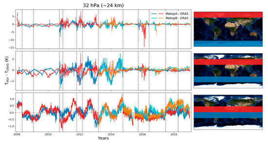 At 24 km (Figure 7), differences are quite small (~1 K) until 2010 at mid-latitudes and the poles. Between 2010 and 2014, they are larger, with seasonal variations, and after 2014, the differences are very small (except 2016). At the equator, the differences are small during the whole 2008–2018 period and the algorithm updates do not seem to have an effect on how they change.