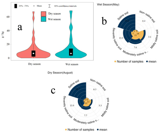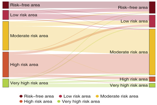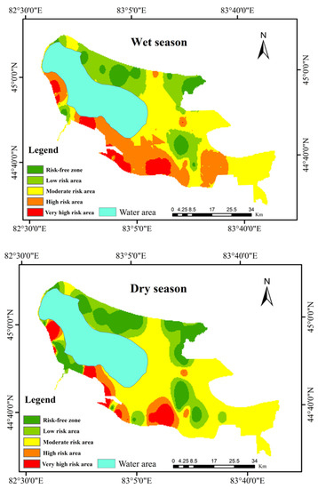 - From the Sankey diagram’s transfer matrix, it was found that, as the season moves from wet to dry (from May to August), moderate-risk area (in the wet season) shifts to low risk and risk-free (in the dry season). Similarly, the area of high risk in the wet season shifts to moderate risk in the dry season. This is mainly because the reduction in the volume of water in the lakes decreases the “water action” of the salt-accumulating environment from wet to dry seasons.