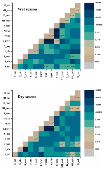 - The correlation coefficients of risk assessment factors of salinization in the study area were obtained. During the wet season, the weighting factor of the soil salinization risk evaluation factor was greatest with the plant senescence reflectance index (PSRI), followed by the deep soil water content (D_wat) and the shallow soil salinity content (SH_sal). During the dry season, the weighting factor for the salinization risk evaluation factor was highest for shallow soil salinity content (SH_sal), followed by land use and land cover change (LUCC) and deep soil water content (D_wat).