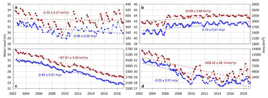 Water level (blue) and surface area (red) changes in the four parts of the Aral Sea. (a) Tchebas Bay; (b) the North Aral Sea; (c) the West Aral Sea; and (d) the East Aral Sea.