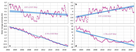 Water storage anomaly (Gt). (a) Tchebas bay; (b) the North Aral Sea; (c) the West Aral Sea; and (d) the East Aral Sea. The solid blue line is the long-term trend in the water storage, and the blue shade represents the 95% confidence interval.