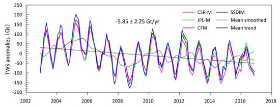 In contrast, four GRACE solutions have a higher accordance with the TWS anomalies of the endorheic basin (Figure 7). In particular, these time series have similar amplitudes and phases during the study period. Compared with the various magnitudes and temporal patterns of the four solutions for the Aral Sea, they show an excellent ability to detect the TWS changes on larger basin scales. The mean TWS change rate calculated from the four solutions is −5.85 ± 2.25 Gt/year, which is lower than that reported by Wang et al. (JPL-RL05M: −7.31 ± 1.68 Gt/year) [22]. The improvement of the data quality and the extension of the recording timespan in the latest GRACE products (RL06) may be the main reasons for this difference. In addition, we performed a 13-month smoothing of the mean TWS anomaly time series. In 2005 and 2010, the TWS growth in the basin was significant, while in 2008–2009, there was a distinct decrease in the TWS in the endorheic basin. The Aral Sea behaved similarly during this period (Figure 5). This shows that as the terminal lake, the Aral Sea acts as an indicator of extreme hydrological events (e.g., floods and droughts). However, this also indicates that the intensities and scopes of the three extreme events are so large that they can be captured by the GRACE data at the basin scale.