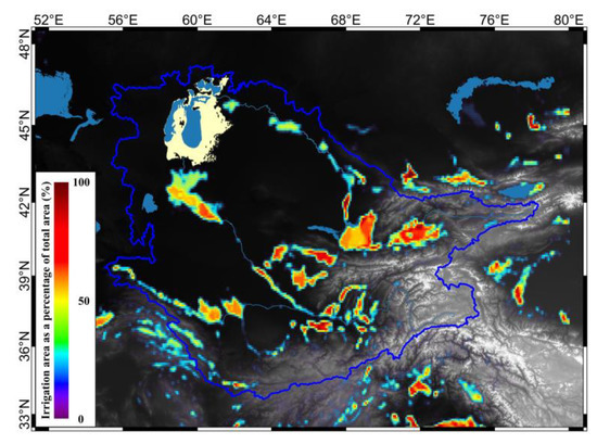 Irrigation area in the endorheic basin (area equipped for irrigation expressed as the percentage of total area). Date from the Global Map of Irrigation Areas version 5 [81].