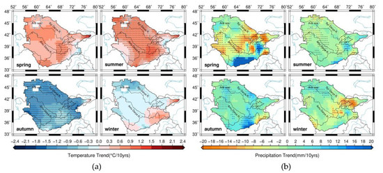 (a) Spatiotemporal variations in the seasonal temperature (2002–2018). (b) Spatiotemporal variations in seasonal precipitation (2002–2018). (Spring: March, April, and May; Summer: June, July, and August; Autumn: September, October, and November; Winter: December, January, and February) The black dots represent a significant trend at levels of p < 0.1.