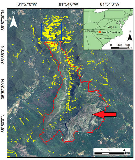 Linville Gorge Wilderness area is located on the eastern edge of the southern Appalachian Mountains in North Carolina, USA (Figure 1). The study area has a rugged terrain with an elevation ranging from 280 to 1300 m. This study focuses on the southern part of this wilderness area of approximately 135 km2. Although the majority of wilderness area remains unlogged [65], two major forest disturbances have occurred since the early 1990s. The first one is HWA infestation in the lower Linville Gorge watershed ([66]; Figure 1), and the second is recurrent wildfires in the southern part of the lower watershed [5,65,66]. Hemlock defoliation in this study site was first reported in the early 2000s [67], and prior to this the defoliation riparian area was dominated by hemlocks in the presence of dense Rhododendron maximum shrubs in the understory [5]. Since the 1950s, this region had not been subjected to large-scale fires until November 2000 [68], when about 4000 ha of the wilderness area was burned by the Brushy Ridge human-initiated fire [5]. Two recent human-initiated fires, “Shortoff and Linville Complex” and “Pinnacle”, were ignited in May 2007 and through June burned about 970 ha and 2000 ha within the gorge area, respectively [5,66]. A large portion of the Pinnacle fire overlapped with the 2000 Brushy Ridge fire [5,66]. Most recently, the White Creek fire burned the same area in March 2017. However, visual interpretation of 10 June 2016, and 3 July 2018, National Agriculture Imagery Program (NAIP) images (with a 1m resolution) showed that this fire was not as extensive as the 2000 and 2007 wildfires.