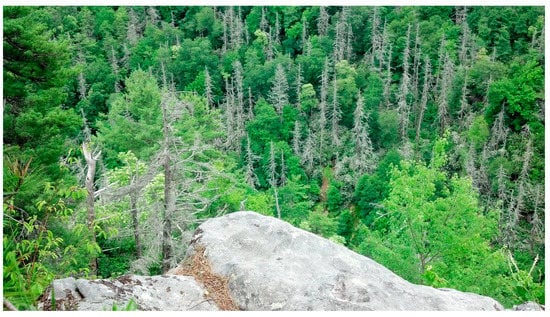 - Kantola, T.; Lyytikäinen-Saarenmaa, P.; Coulson, R.N.; Strauch, S.; Tchakerian, M.D.; Holopainen, M.; Saarenmaa, H.; Streett, D.A. Spatial distribution of hemlock woolly adelgid induced hemlock mortality in the Southern Appalachians. Open J. For. 2014, 4, 492. [Google Scholar] [CrossRef][Green Version]