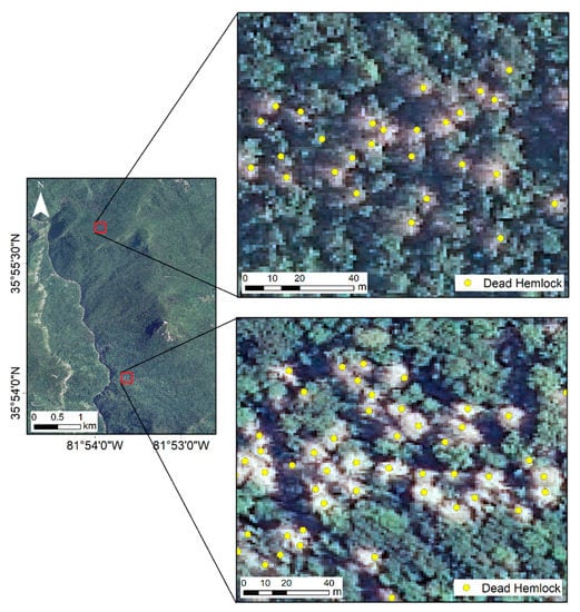 Examples of the digitized dead or dying hemlocks (yellow points) on the National Agriculture Imagery Program (NAIP) image (5 July 2010) at two sample sub-regions of the study site.
