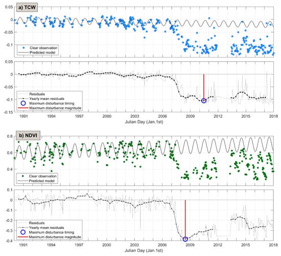 The spectral trajectories of (a) wetness (TCW) and (b) Normalized Difference Vegetation Index (NDVI), their residuals (light grey lines), and the mean values within 1-year moving windows with 3-month steps (solid black line with dots in lower panels) at a Landsat pixel with a fire in 2007. The residuals were the difference between the observed and projected values (dark grey line) fitted by Equation (1) before 2000. The maximum disturbance magnitude (red lines) and its timing (blue circles) are shown in the mean residuals’ trajectories.