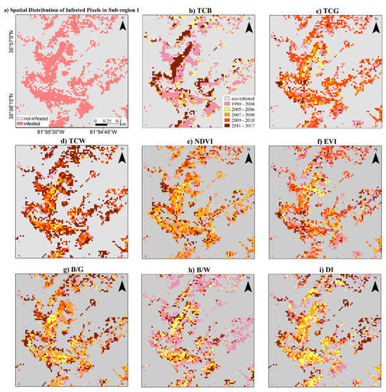 The spatial distributions of the maximum disturbance timing from eight spectral indices (Table 1) within sub-region 1 with 80 × 80 Landsat pixels (Figure 1). TCW and NDVI timing maps show the best agreements with the distribution of the infested pixels; however, the TCB and B/W timing maps show the weakest performance. The legend in map (b) applies to all maps.