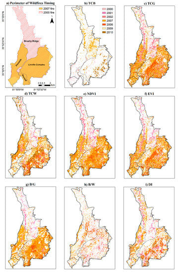 Spatial distributions of (a) 2000 and 2007 fire perimeters by the Wildland Fire Decision Support System (WFDSS) fire history map, and the maximum disturbance timing maps derived from eight spectral indices within sub-region 2 (Figure 1): (b) brightness (TCB), (c) greenness (TCG), (d) TCW, (e) NDVI, (f) Enhanced Vegetation Index (EVI), (g) TCB/TCG (B/G), (h) TCB/TCW (B/W), and (i) Disturbance Index (DI) (Table 1). The legend in map (b) applies to all the maps.