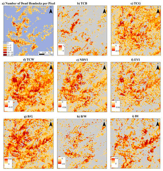 (a) Number of dead hemlocks digitized from the high-resolution aerial photos, and maximum disturbance magnitudes within a sub-region 1 (Figure 1), estimated from eight spectral indices: (b) TCB, (c) TCG, (d) TCW, (e) NDVI, (f) EVI, (g) B/G, (h) B/W, and (i) DI (Table 1). Grey pixels are the pixels with no significant changes from the pre-disturbance condition.