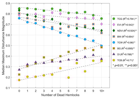 Linear regressions between the number of dead hemlocks and the median maximum disturbance magnitudes for the eight spectral indices from the pixels with the same number of dead hemlocks: TCB, TCG, TCW, NDVI, EVI, B/G, B/W, and DI (Table 1). All the regression lines are statistically significant (p < 0.01).