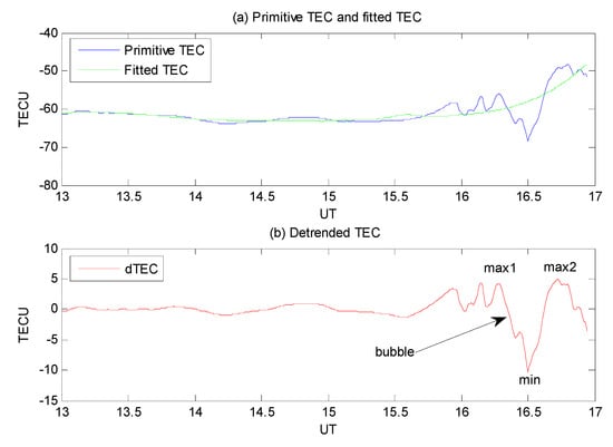 Next, we fit the primitive TEC time series to eliminate the trend term and constant carrier phase ambiguities. Here, the third-order Savitzky–Golay smoothing filter with moving window length of 2 h was employed [,]. Then, the detrended TEC (dTEC) time series that might contain plasma bubble were computed as follows
